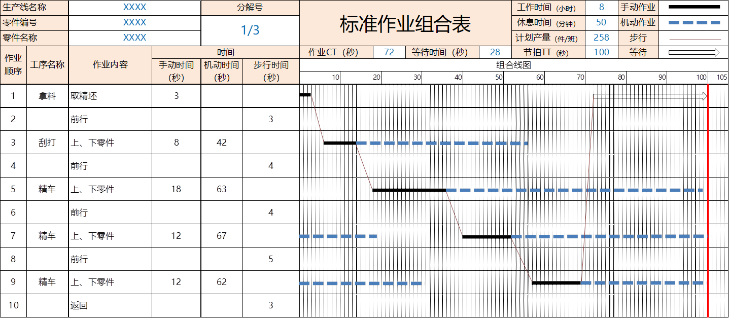 明确各工序的手工作业时间及步行时间,用于考查T.T(节拍时间)内作业者能够承担多大范围的作业。如果大于T.T,就标识无法生产出必要数量的产品,必须通过加班或者其他方式来完成。如果小于T.T,就表示生产能力过剩或者有等待浪费。追求T.T平衡,是改善的目的。