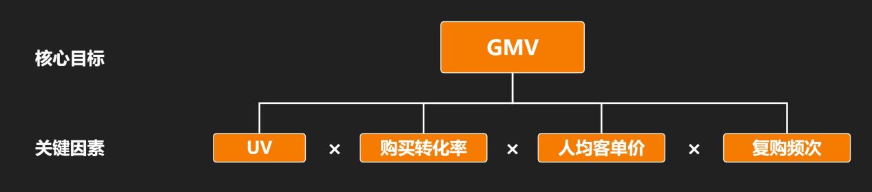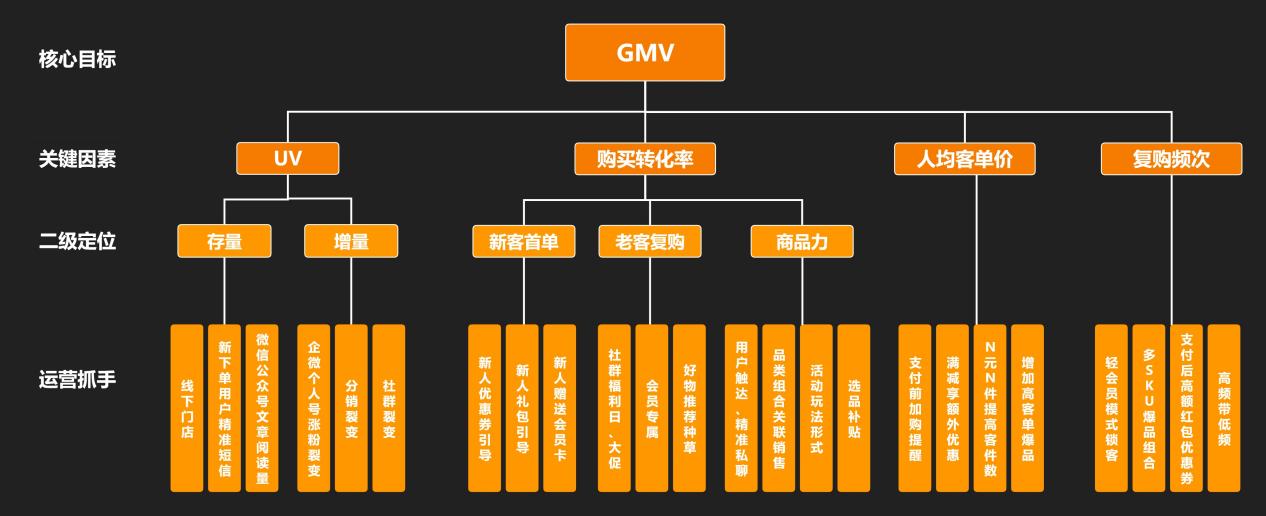 假设社群运营的目标是产品销售 GMV,那么这时候我们只需要去看,想要提升GMV,关键需要抓住哪些因素?