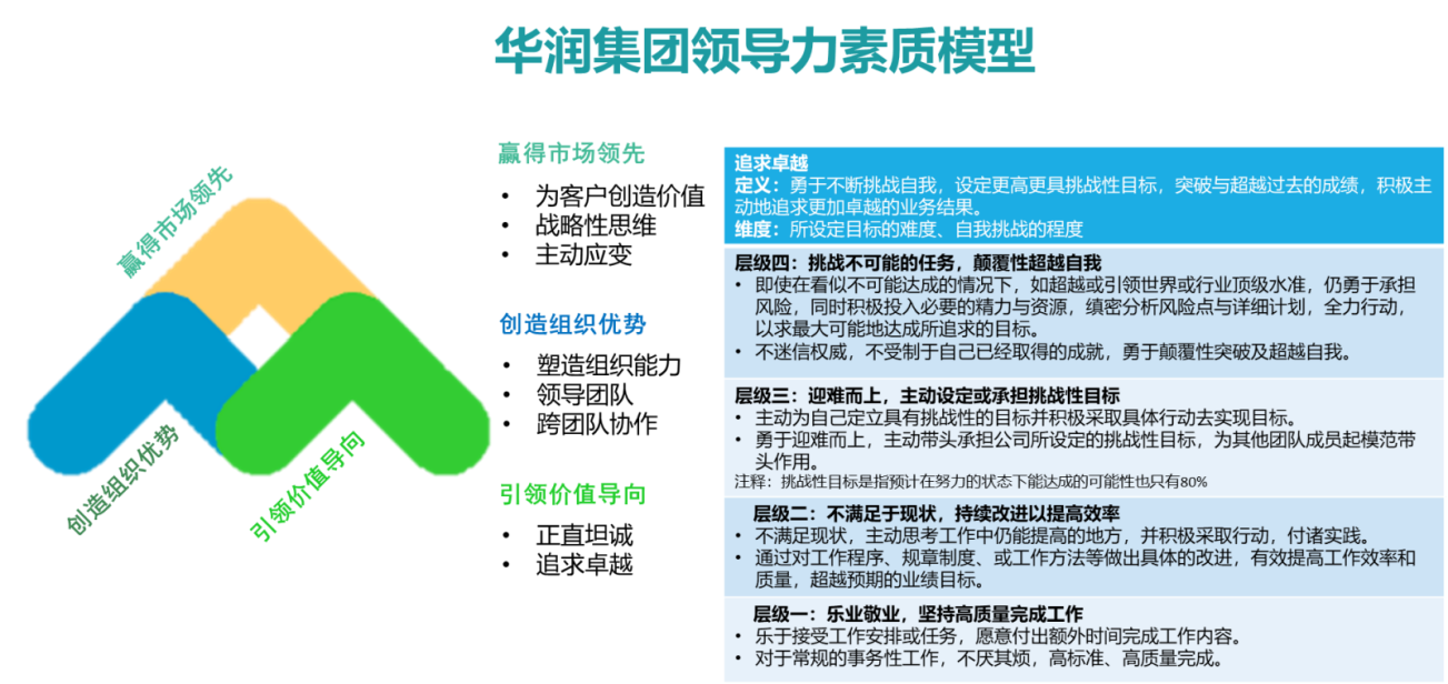 总结一下,华润集团的这个领导力素质模型是做得很系统完整的一个模型,除了模型结构完整清晰外,从构图形状和构图颜色都深入地诠释了公司战略、文化及机制的内涵,即完整清晰又突出企业特点,实为建模的一个标杆。