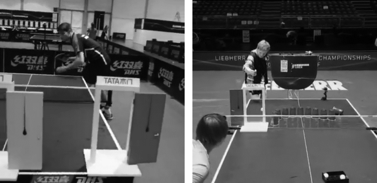 如图2-7所示,这是我在写书期间某微信群里看到的小视频截图,某品牌木门企业联手红双喜集团组织了一场趣味乒乓球活动,由世界顶尖的高手打出精确球路,乒乓球撞击对面的小门开关。第二张图是由选手打出弧线球,球进入对案的小门后沿纸杯摆放的弧形路线打进最后一只杯中。这样有趣的视频转发量很高,企业品牌的曝光度也很高。除了视频、精心制作的图片、音乐、文章都会被转发,植入其中的广告迅速传播。