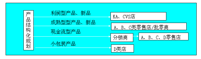 企业不仅要规划分销渠道的销量比例,如前面所举家电分销结构的案例,而且要根据终端类型特点进行产品组合规划。食品企业的终端类型结构化基本原则是: