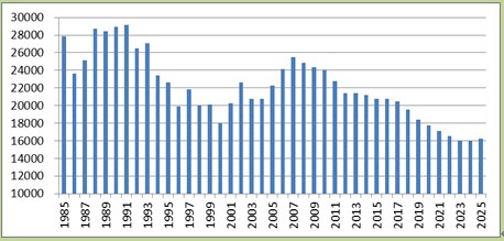 我们把20岁的年轻人作为企业的适龄工人,从1985年开始,每年年轻工人供给企业和社会的数量如图1-2所示。