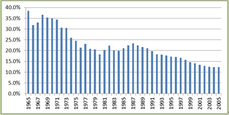 我们先来看一组统数据。这组数据统计了1965—2005年30年间中国的人口出生状况,如表1-1和图1-1所示。