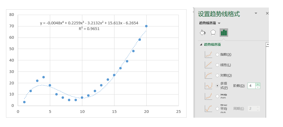 当选择了4阶数的多项式趋势线,可以看到曲线呈现良好的拟合度,并且显示R平方值为0.9651。这意味着96.51%的响应变量变化可以用模型中的预测变量来解释。
