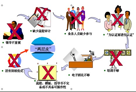 我在一些企业中还发现,流程得不到执行是因为流程制订的目的不端正,是为了通过认证而制订流程。我调研的一家企业,通过了ISO9000体系认证,制订了一大堆程序文件,装订也非常精美,但在实际运作中没有得到执行。后来我了解到,这套文件是从某家认证公司花了4万多元买来的,只是走过场。企业通过了认证,在宣传手册上写上公司通过了××认证。不只是ISO9000体系,我发现制药企业的GMP体系认证也出现了类似现象,集成能力成熟度模型CMMI体系认证也慢慢地走偏了。