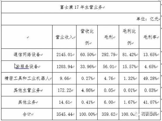 公司的主营业务包括通信网络设备、云服务设备、精密工具及工业机器人等的专业设计制造。2017年富士康获得了3545亿元的营业收入。而在这之中,通信网络设备又是绝对的大头,按收入计,2017年获得了2145.01亿元的营业收入,占了总业务比例的60.50%,按业务毛利算更是占了高达81.42%。