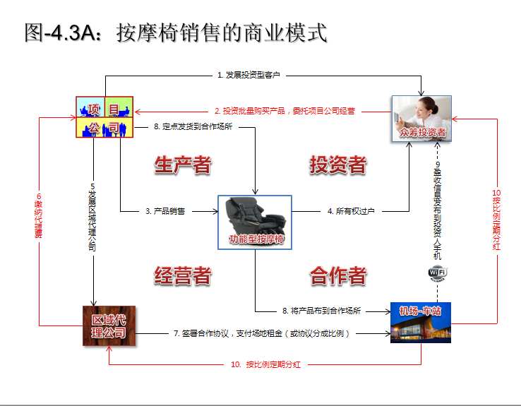 项目公司会在各个城市招收代理商,由代理商与当地的飞机场、火车站、游乐场、购物中心等签订合作协议,由后者提供场地,摆上几十台按摩椅供往来旅客休息,并提供免费WIFI。旅客享受按摩椅按时间收费,通过WIFI用微信或支付宝当场支付。每台按摩椅赚来的钱首先给场地提供方比例分成(例如30%),然后项目公司和代理商扣除管理费和税费(例如20%),之后剩余的利润(例如50%)分配给购买按摩椅的理财投资人。由于按摩椅设计有自动计费功能和WIFI传输功能,投资者只要打开手机,就可以知道他们的资产每天赚了多少钱,并且自己能分到多少钱。后来我给他的这种投资产品命名为“打开手机就往下掉钱”的理财模式。